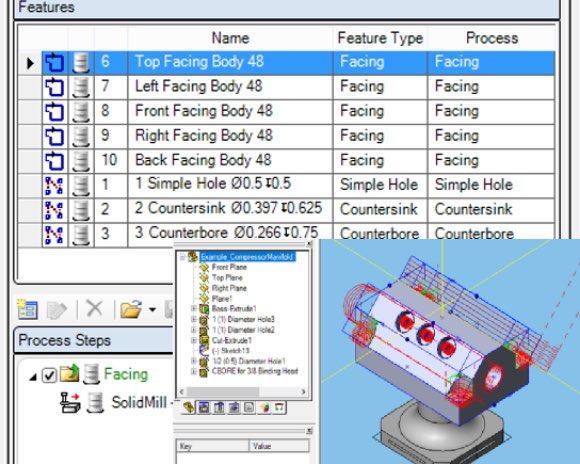如口袋,鍵槽,和孔等特徵。每一特徵又包含一系列已知的加工資訊,包括高度,厚度,斜度,體積和面積。以車間標準,術語,以及不同特徵特性為基礎,資料庫元件自動將這些特徵分類。