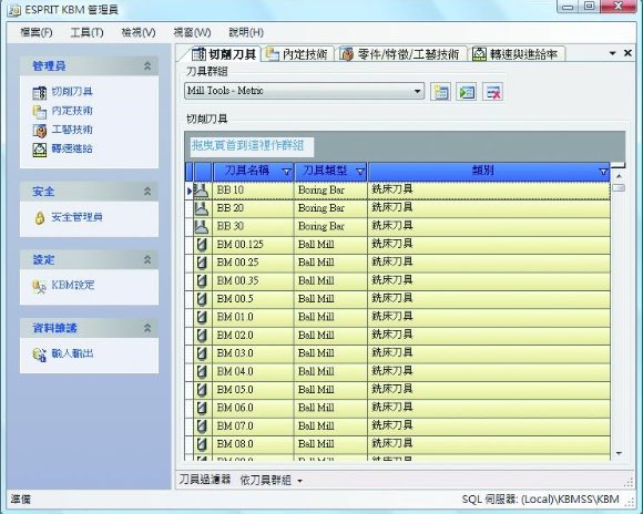 刀具管理提供了一種有效管理切削刀具資訊的方法,以便一致而又準確地選擇刀具。這個強大的切削刀具資料庫是一個多用戶的資料庫,與工法參數管理整合在一起去提供刀具的自動選擇並能在任何需要時,都能被輕鬆快速的存取。