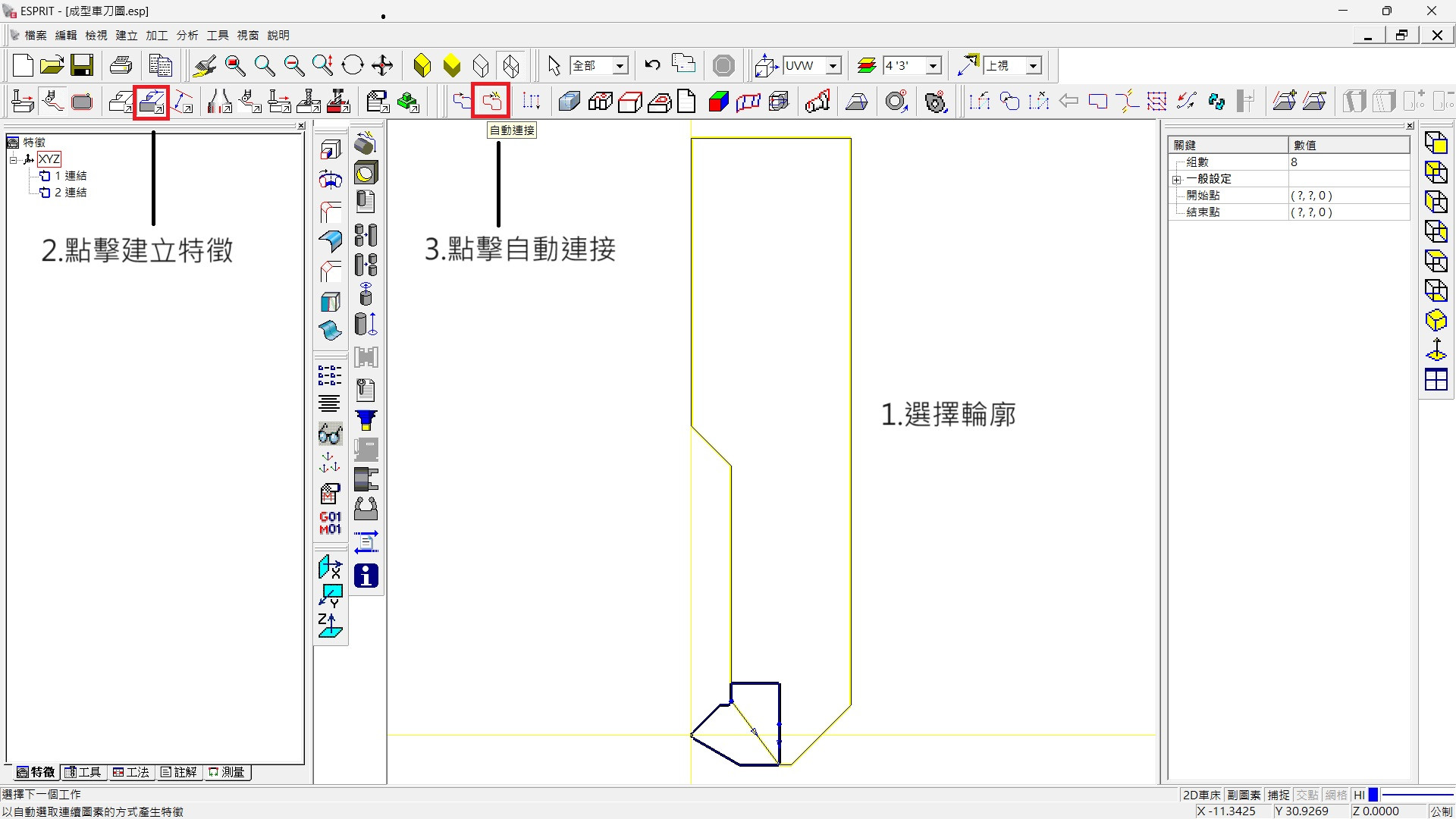 (選擇輪廓 → 建立特徵 → 自動連結)