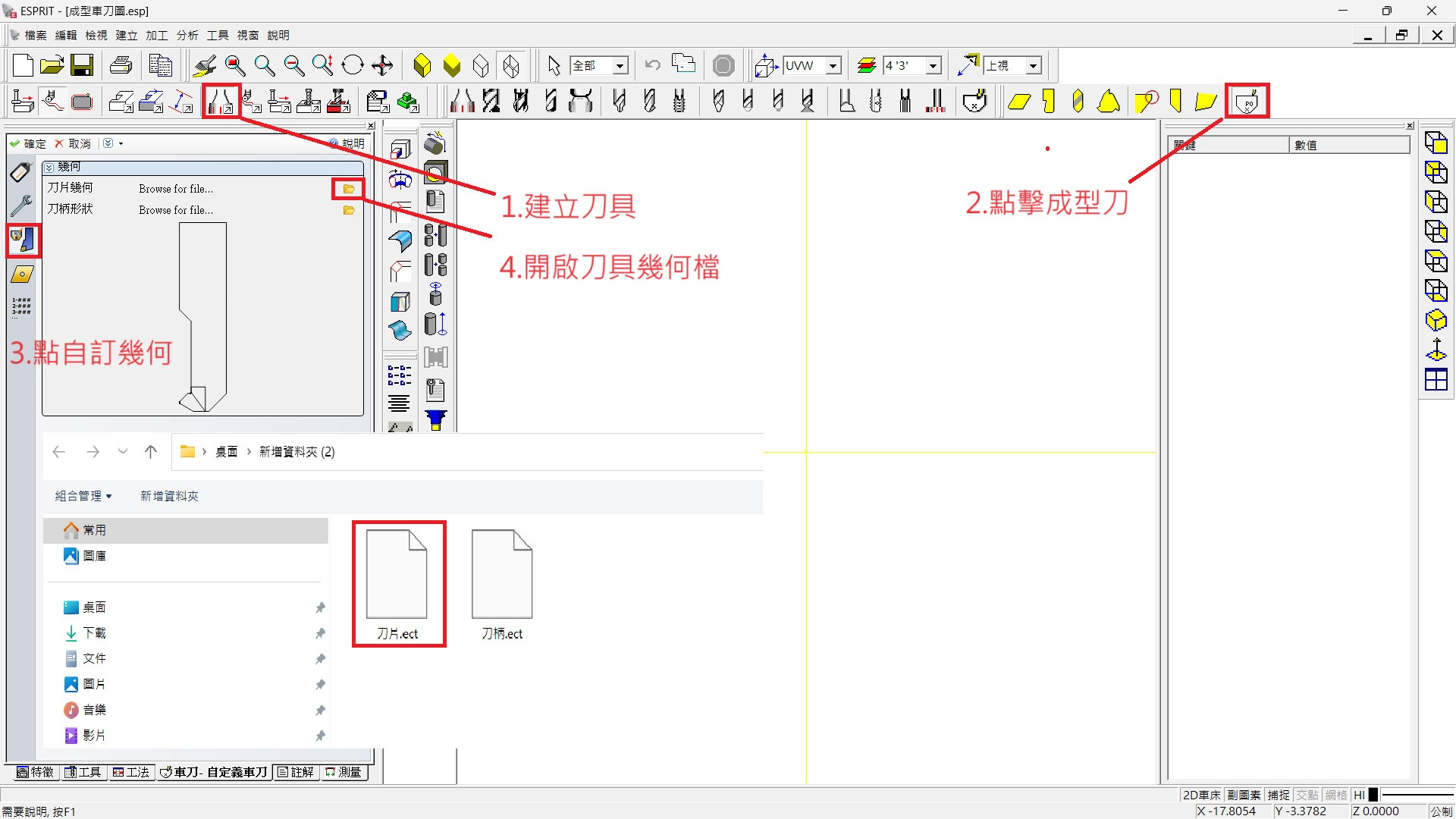 (選擇車床刀具 → 成型刀 → 刀具 → 開啟刀具幾何檔案 → 分別選擇您的成型刀片、刀柄.ect檔案)
