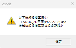 車床模組 銑床模組 車銑複合(SWISS 走心) 車銑複合(MILL TURN 走刀) ESPRIT 環境設定 Q1: 如何改善車床加工纏屑問題與提高加工效率 Q2: 特徵編輯技巧 Q3: 異型模擬素材設定 Q4: 3D實體定位與如何產生路徑 Q5: 成型車刀設定 Q6: 後處理檔案遺失排除 Q6: 後處理檔案遺失排除 09-03-2024 後處理檔案遺失排除 1