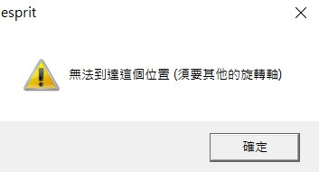 車床模組 銑床模組 車銑複合(SWISS 走心) 車銑複合(MILL TURN 走刀) ESPRIT 環境設定 Q6: 如何設定ZC同動圓孔倒角 Q1: 車削如何設定倒角退刀 Q2: 模擬出現錯誤訊息 Q3: 如何設定背軸素材 Q4: 匯入曲面檔案時如何轉換為實體 Q5: 設定傾斜刀具 Q2: 模擬出現錯誤訊息 01-19-2021 模擬時跳出錯誤訊息,需要其他的旋轉軸 1