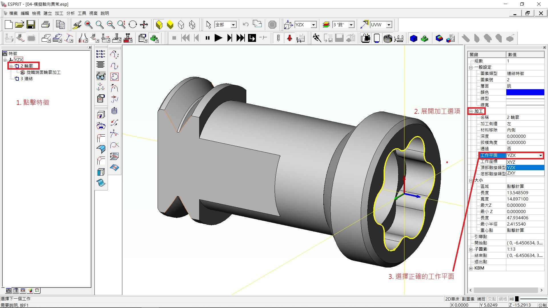 1. 點擊特徵檢視屬性欄位中工作平面是否設定合理