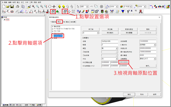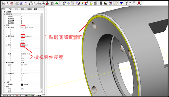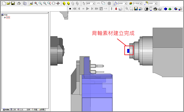 07-23-2021 Q3: 如何設定背軸素材 如何設定背軸素材 1. 分析零件尺寸,掌握模擬素材的尺寸點擊外徑查詢外徑尺寸 2. 點擊端面查詢零件總長 3. 查詢背軸原點位置 4. 於模擬參數頁面,建立背軸素材 5.背軸素材建立完成 回上一頁
